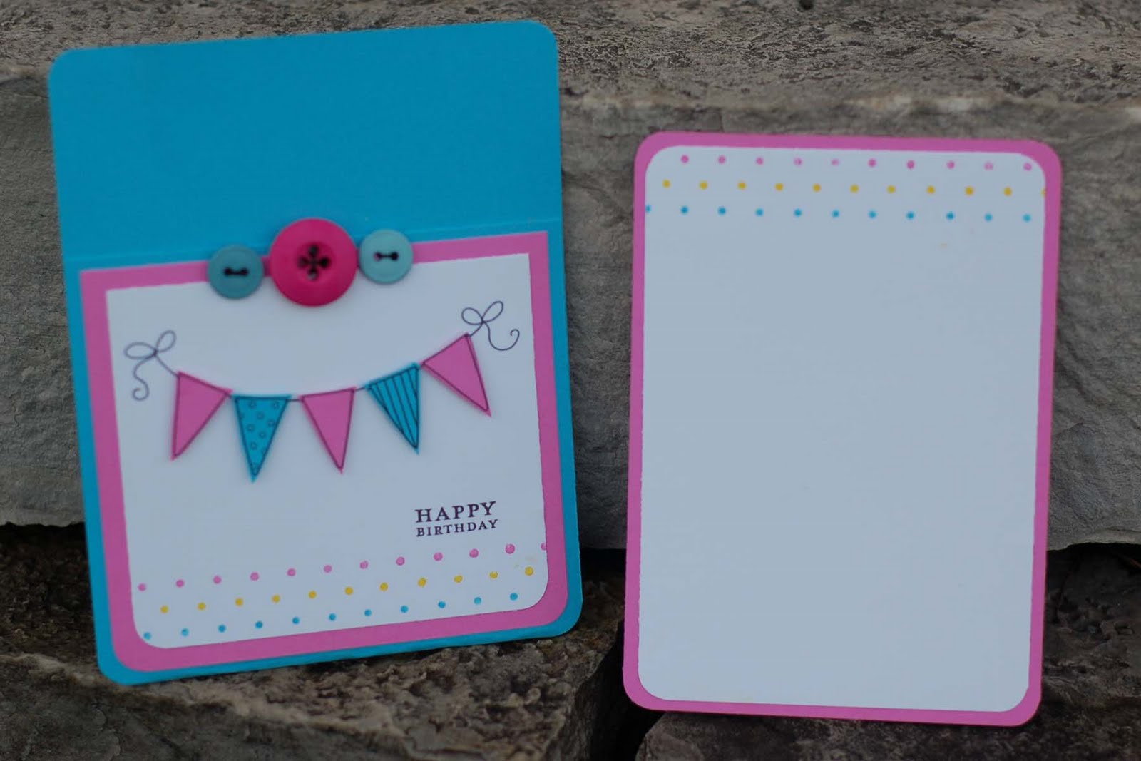 First Card: Digital Doodles Party Banner, Stampin' Up Vintage Labels Stamps, PTI Polka Dot Basics; Stampin' Up YoYo Yellow, Pixie Pink and Tempting Turqoise Card Stock and Ink; PTI Buttons; Black String