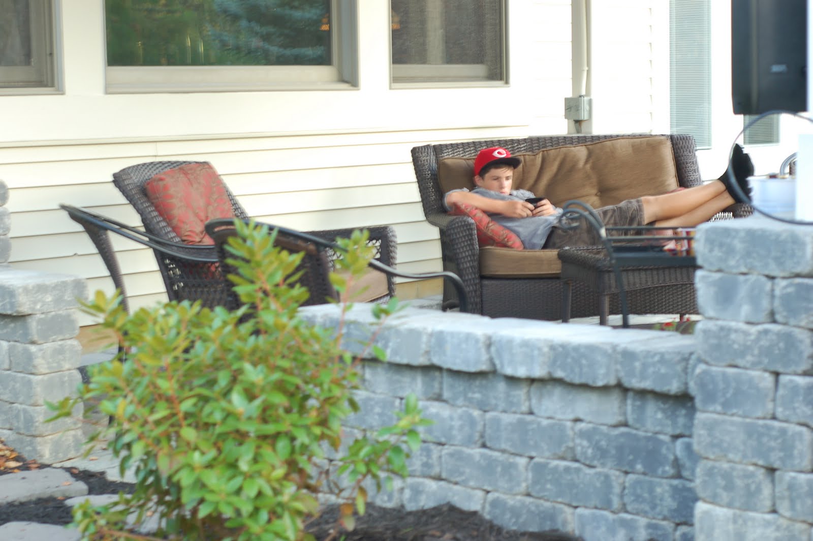 From the side yard...Ryan relaxing...watching the game and texting...