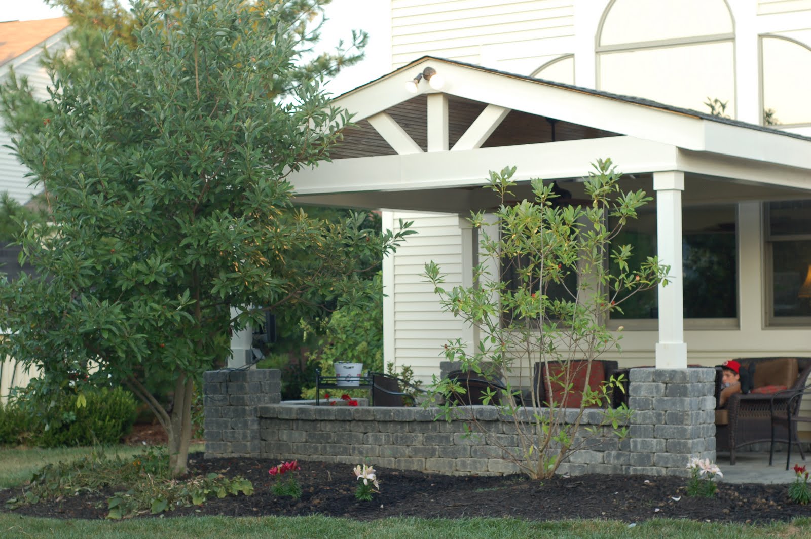 Prior to a couple of months ago, we had a stamped concrete patio with a hot tub on it. We sold the hot tub because Pat no longer needed it for his back pain. When we sold the hot tub, Pat started to cover a portion of the patio. Just like I love to craft, he loves to draw sketches of rooms, landscaping, etc. After several drawings...he got started on the patio, covered it and added the stone wall and pillars.