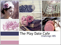 The start of a new week and the weather is gorgeous in Cincinnati. Not our usual hot and humid summer days, but a nice cool, crisp day! I played a bit this weekend with distress inks. For today's card, I stamped several flowers in Versamark and then heat embossed them with clear embossing ink. I then applied Tattered Rose distress ink to the whole panel. The colors are inspired by this week's Play Date Cafe Challenge. I love the Prima flowers on this too. The best part is that the bottoms of the flowers are flat and come with glue dots so they are very easy to adhere!