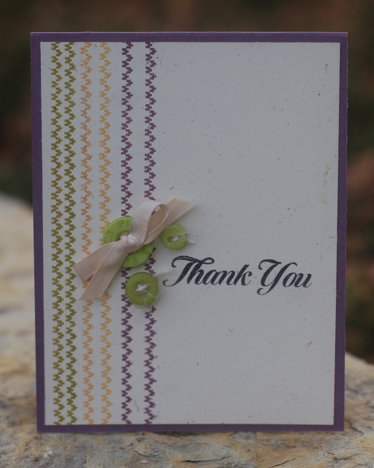 And I have a challenge card for the new Runway Inspired Challenge. I was inspired by the stripes and the colors on the model in the background. The stripes are done with a WPlus9 set and the sentiment is from Hero Arts. The touch of ribbon is inspired by Maile Belles :). Hope you all have a fabulous Wednesday!