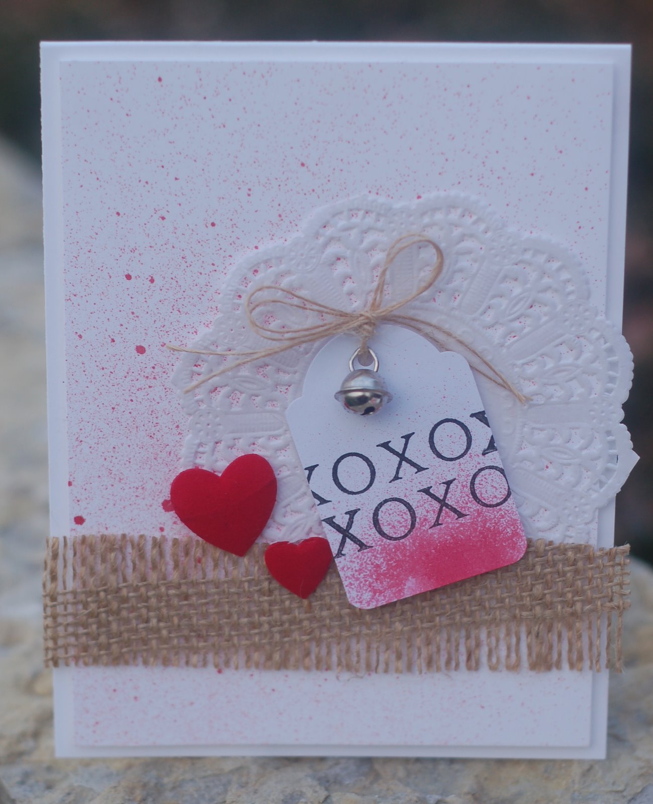 oh, I LOVE this!! doily, tag, hearts! What's not to love? just lovely!! AND so is the card you received (checked it out!). I'm home watching the news in front of the fireplace...made it to the gym after school!! ACK!! I'm crazy! Now I need a nap!! But the week's already half done!! Woohoo!!