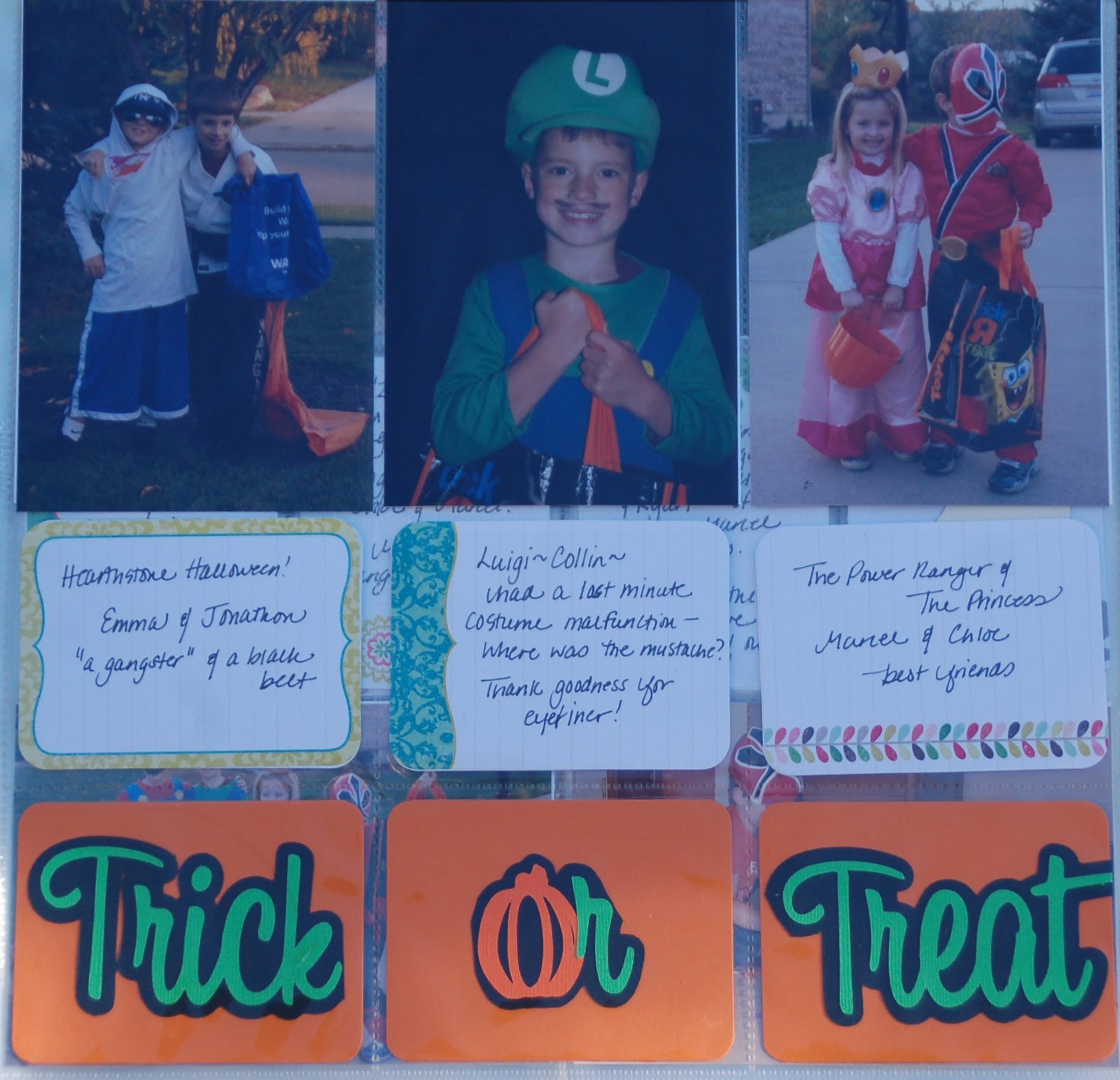 A Halloween page. The top are the photos, middle is the journaling and the bottom are some Silhouette embellishments from my local scrapbooking store.