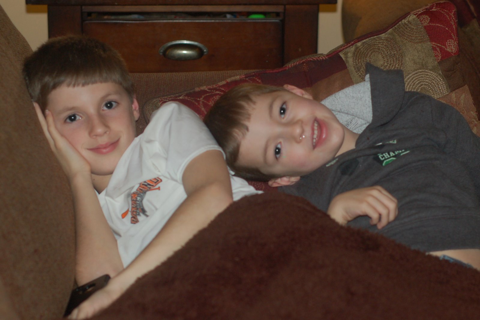 Hello there!  I hope you are all spending time with your family and friends watching the big game...or crafting!  I'm doing a combination of both. These two little guys have been coughing their little heads off most of the day so Pat went out with Collin/Ryan to a neighborhood party and I'm home with these guys.  Good thing they have each other while they are sick.  This is a quick snapshot from tonight and honestly, this is the normal morning scene. These two guys cuddled up on the couch together.  Thankfully they are happy sick boys!