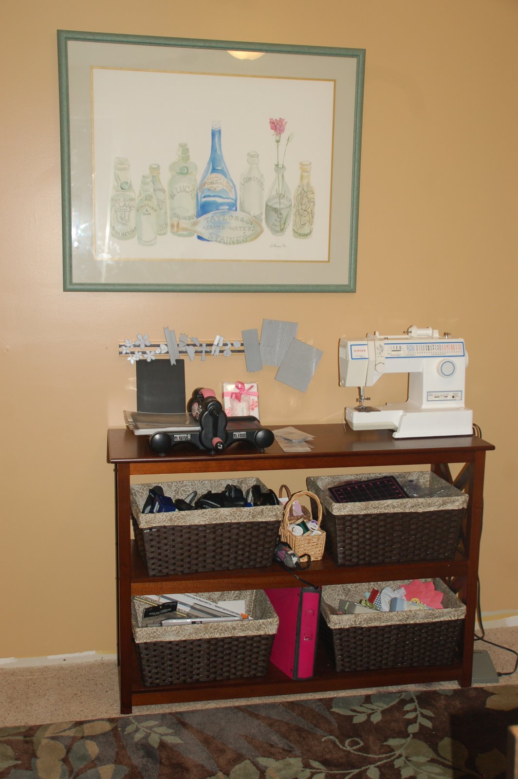 • The pink binder has my dies and the little basket has sewing supplies.