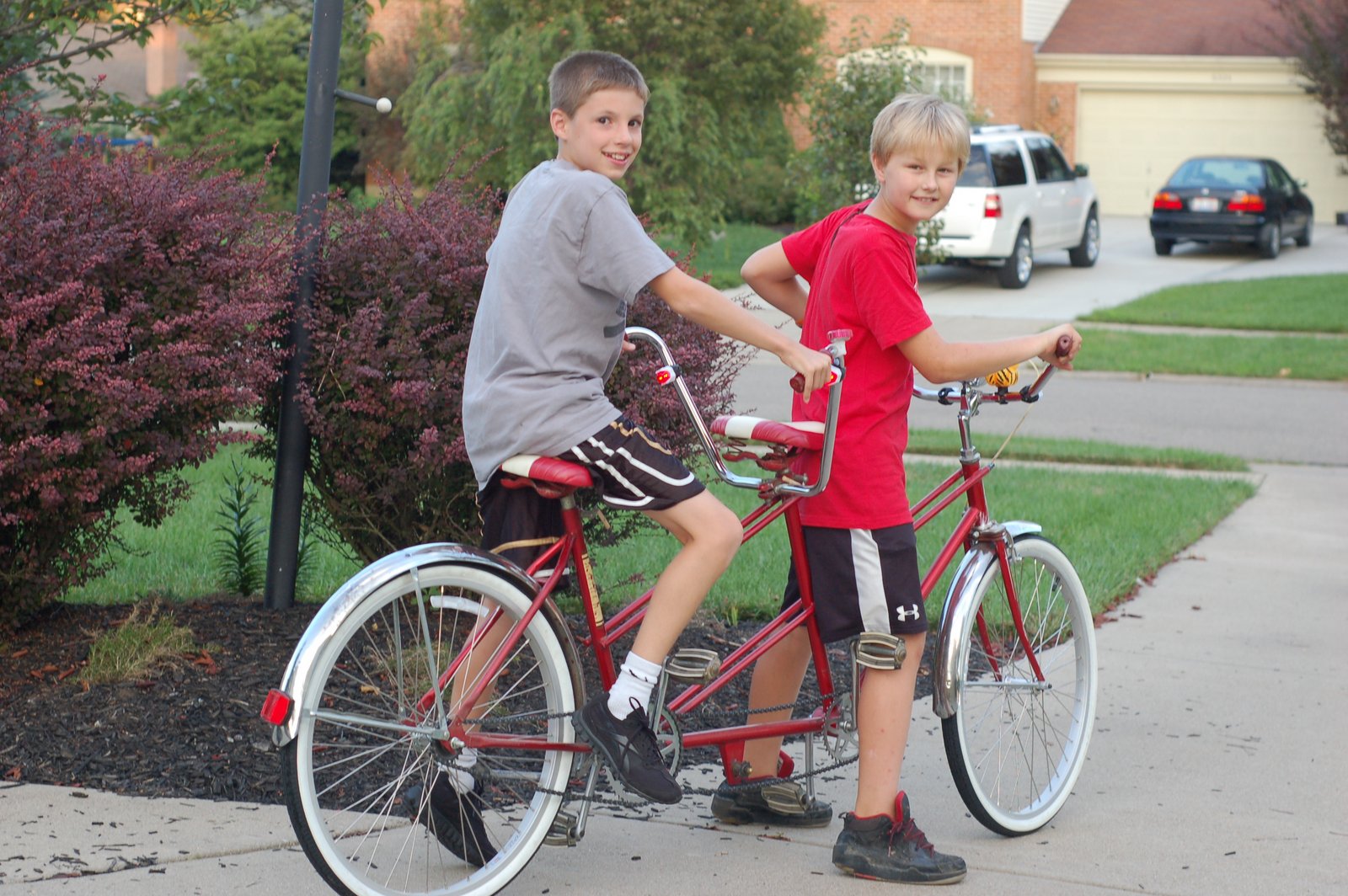 Hi there, I thought I'd pop in and share another fun summer photo with you. Jonathon's friend, Cam, stopped by on Monday night with his tandem bike. Reminds me of when I was a little girl and my parents had a tandem bike. I would ride in the baby seat behind my mum. My mum didn't know how to ride a bike so it was the perfect way to take a ride with both my parents. Cam's dad bought the bike from Craig's List and they really cleaned it up nicely. Jonathon loved riding on it with him!