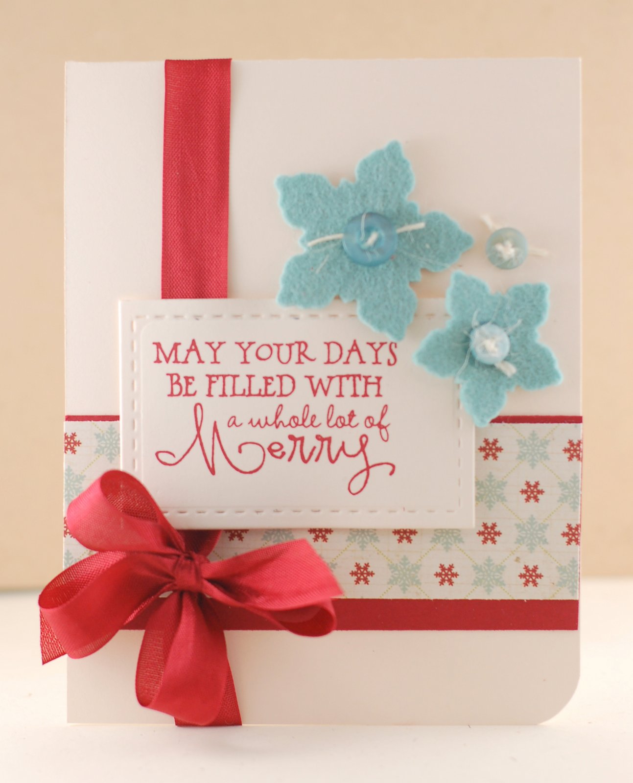 Great mix of cards. Love the first one - those felt snowflakes are great and well done using the ribbon for the vertical panel! You are rocking the snowflakes in the last one and lovely, rich, red on the second.