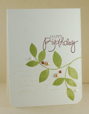For Pat's card, I was inspired by Laurie's Muse card below. I pulled out some of my favorite stamps that haven't seen ink in way too long (PaperTrey Ink's Turning a New Leaf set and Hero Arts French Script for the background stamping...you'll need to look closely!) I finished it off with the sentiment and some Hero Arts Hero Hues gems. I love them...need to use them more often!