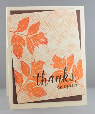 It's time for another challenge at Fusion! Are you enjoying all the challenges around blog land with the gorgeous fall colors?  I love fall colors and had fun playing along this week. Too make my background, I inked up a Hero Arts background stamp with ink and then stamped the leave stamp over it to create a bit of a varied background.   To finish it off, I stamped the leaves and the sentiment.