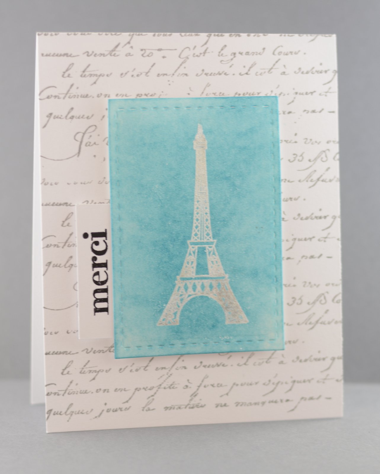 Tres jolie! I love the script background with the Eiffel tower - a wonderful take on the photo! The soft blue is the perfect splash of colour too!