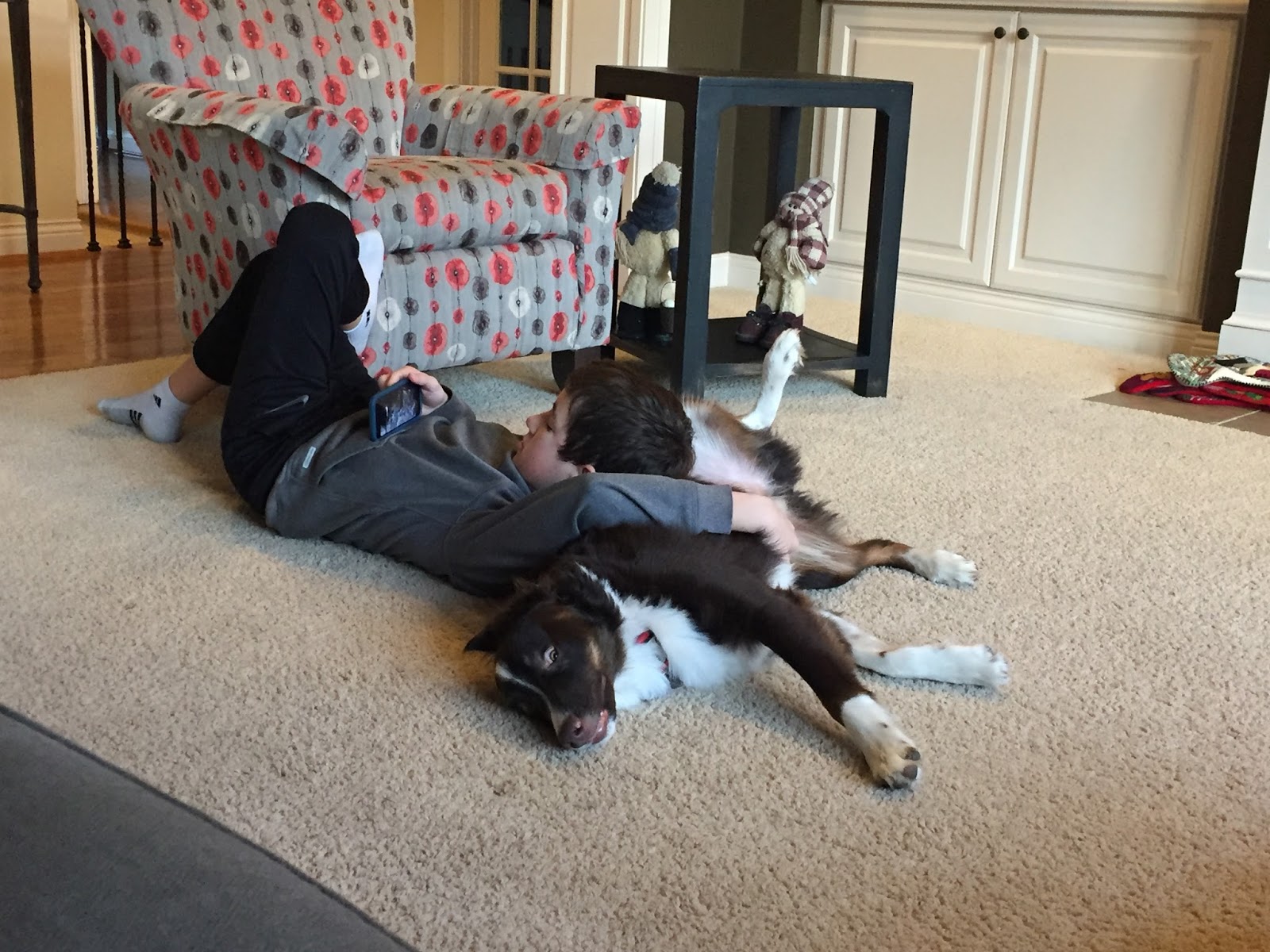 And here's a sweet little picture of Marcel and Nick relaxing together. Marcel was rubbing Nick's belly as he sat and watched videos.