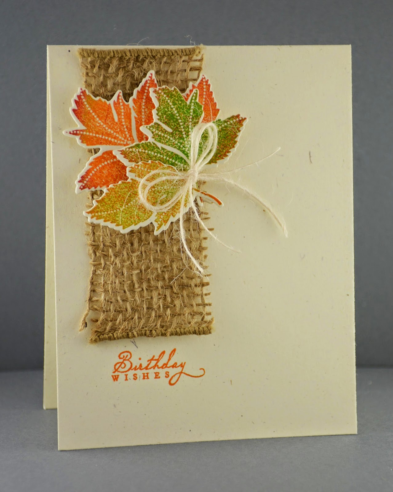 Now...back to my card today. I'm entered this for two challenges: CAS(e) this Sketch and Just Us Girls. Erin should take credit for this as she's been making several fall cards and the burlap was a gift from her. Thanks for the inspiration Erin!