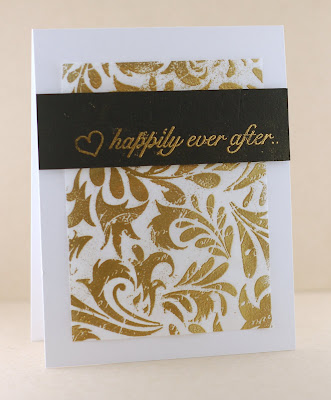 Happy New Year my friends! Since we spent our new year's celebrating a wedding, I thought it would be fun to make another wedding card. The color inspiration from the Just Us Girls photo below was what inspired the card. I stamped the patterned image on vellum and then embossed it with gold embossing powder. I added the sentiment and heart to the black strip. It is a bit messy since I had used my PTI linen impression plate before stamping the sentiment. Woops! I'm happy with the end result.