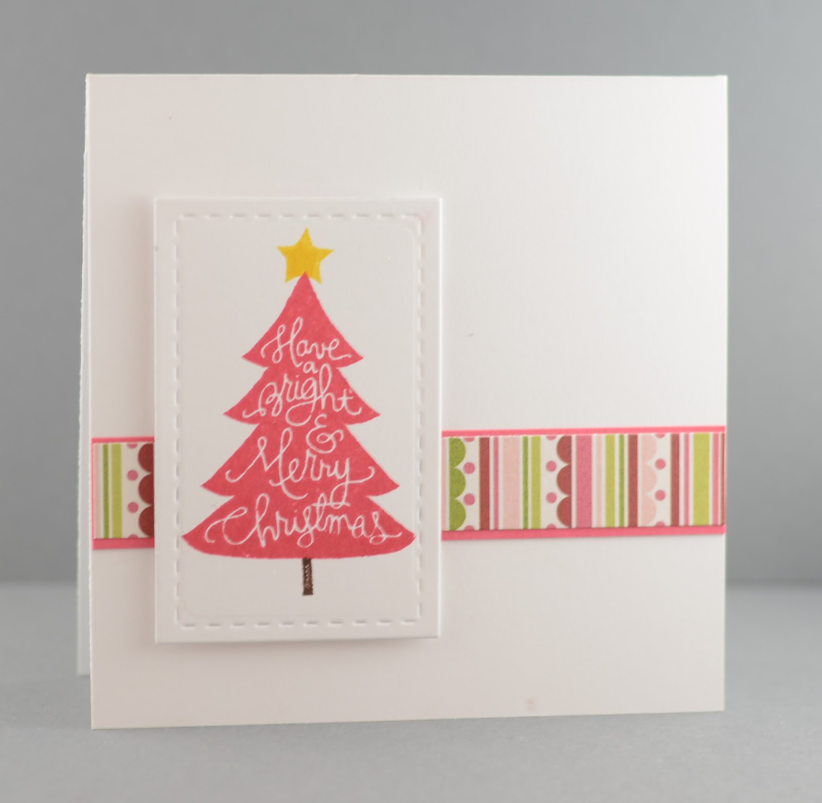 Day 3 in a row of the Christmas cards challenge. Playing along with Just Us Girls sketch challenge this week. A very CAS inky card with a small strip of patterned paper. Not sure I love this one...so I only made one of these, but I definitely love the color combo of pink and green.