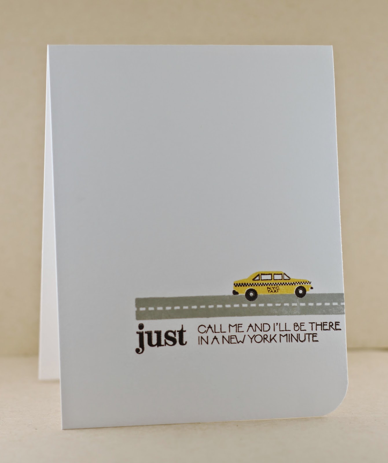 Lately, I'm not doing a great job remembering when challenges expire, etc so I have been keeping a note pad right next to our home laptop where I typically go through Feedly each morning. I'm chotting down challenge themes and the due dates so that when I do have crafty time (typically on the weekens) I know which ones are still current. So...when I saw the current One Layer Simplicity Challeng: Road Trip, I knew immediately that I wanted to pull out this little taxi cab from my PTI set. Perfect easy card for this fun one layer challenge. What about you, have any organization tips for keeping track of challenges where you want to play along? And...I'm curious, when do you get most of your crafting done? Mornings, evenings, weekends?