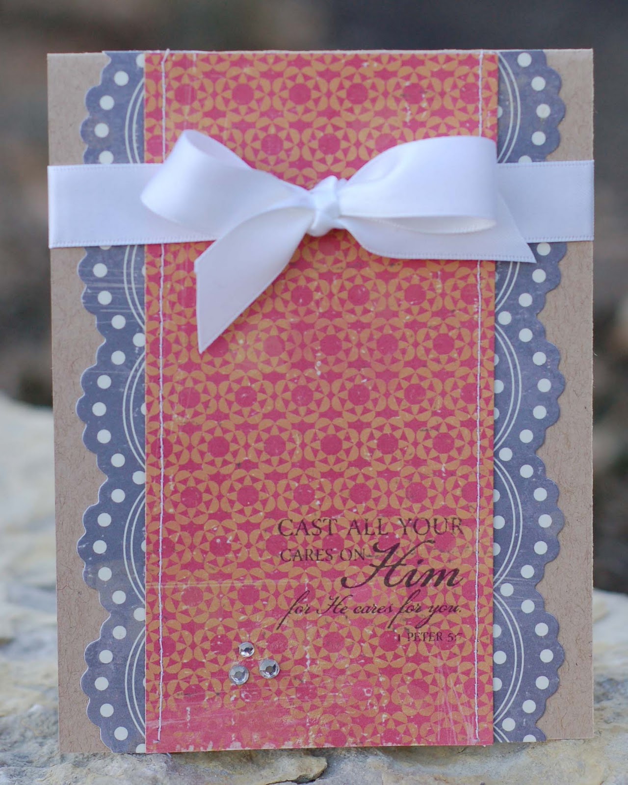 Ingredients:  Bazzill Basics Cardstock; Basic Grey Olivia Paper; Stampin' Up Pretty in Pink Ribbon; Kitchen Sink Ribbon Stamps; PTI Signature Sentiments and Mat Stack Die; Ranger Distress Ink