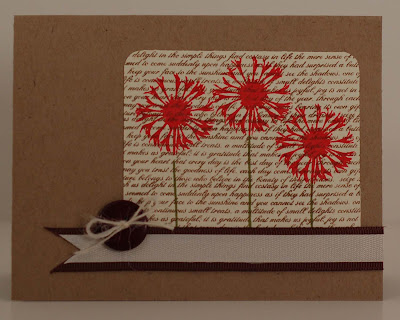 Ingredients:  PTI Kraft Paper; SU Chocolate Chip Ribbon; PTI Twine and Twill; Hero Arts Earth Flowers Stamps; PTI Background Basics Text Style; SU Very Vanilla Paper; Ranger Distress Inks Corduroy, Barn Door, Peeled Paint